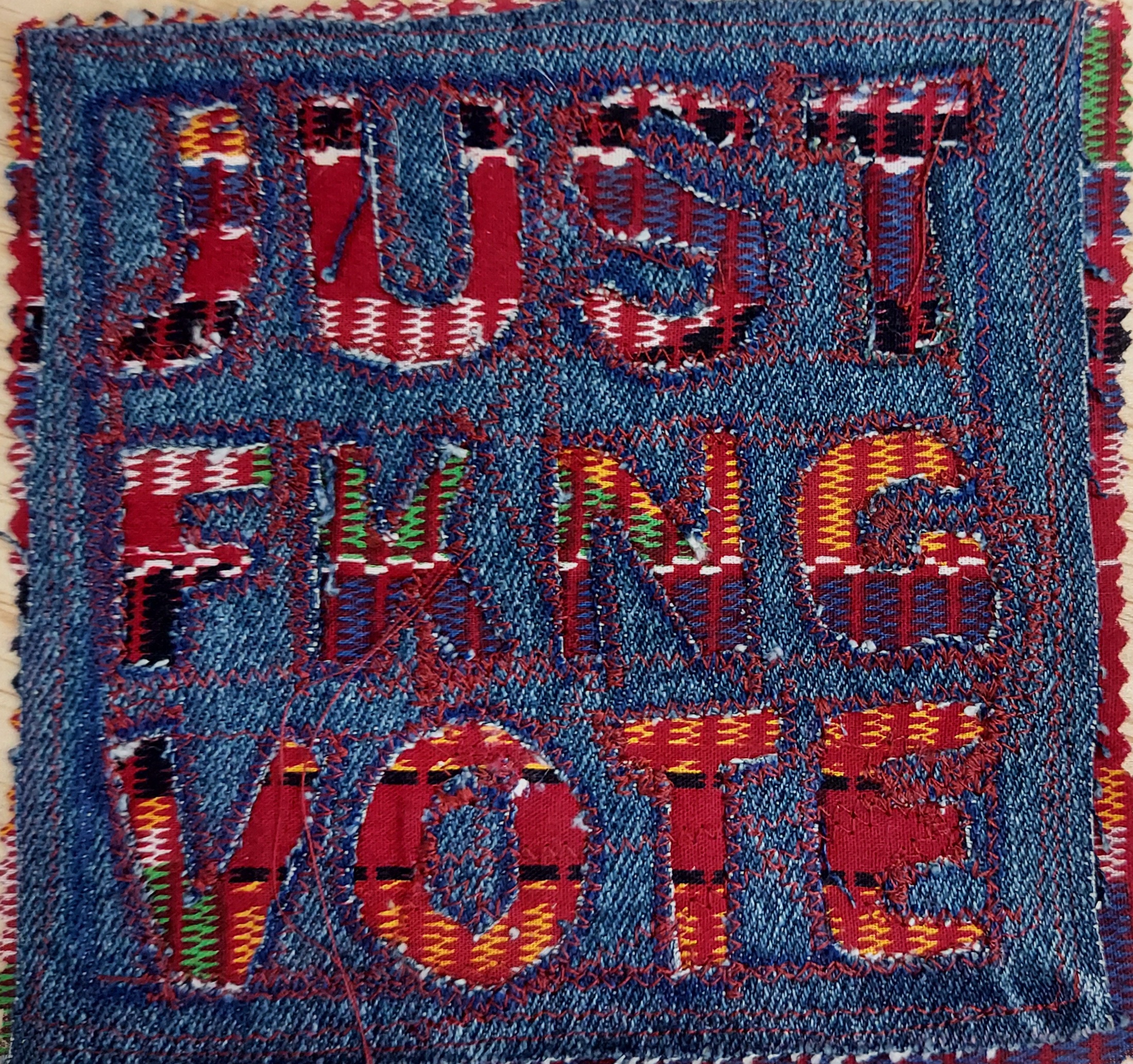 This ain’t your g-moms quilting bee! Handmade, sew-on patches from recycled textiles. For the pro-democracy champions who cannot protest. Message everywhere.